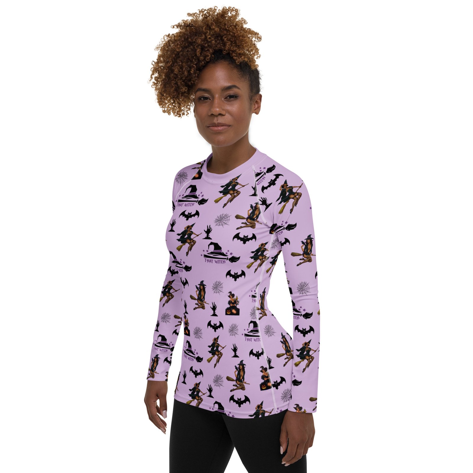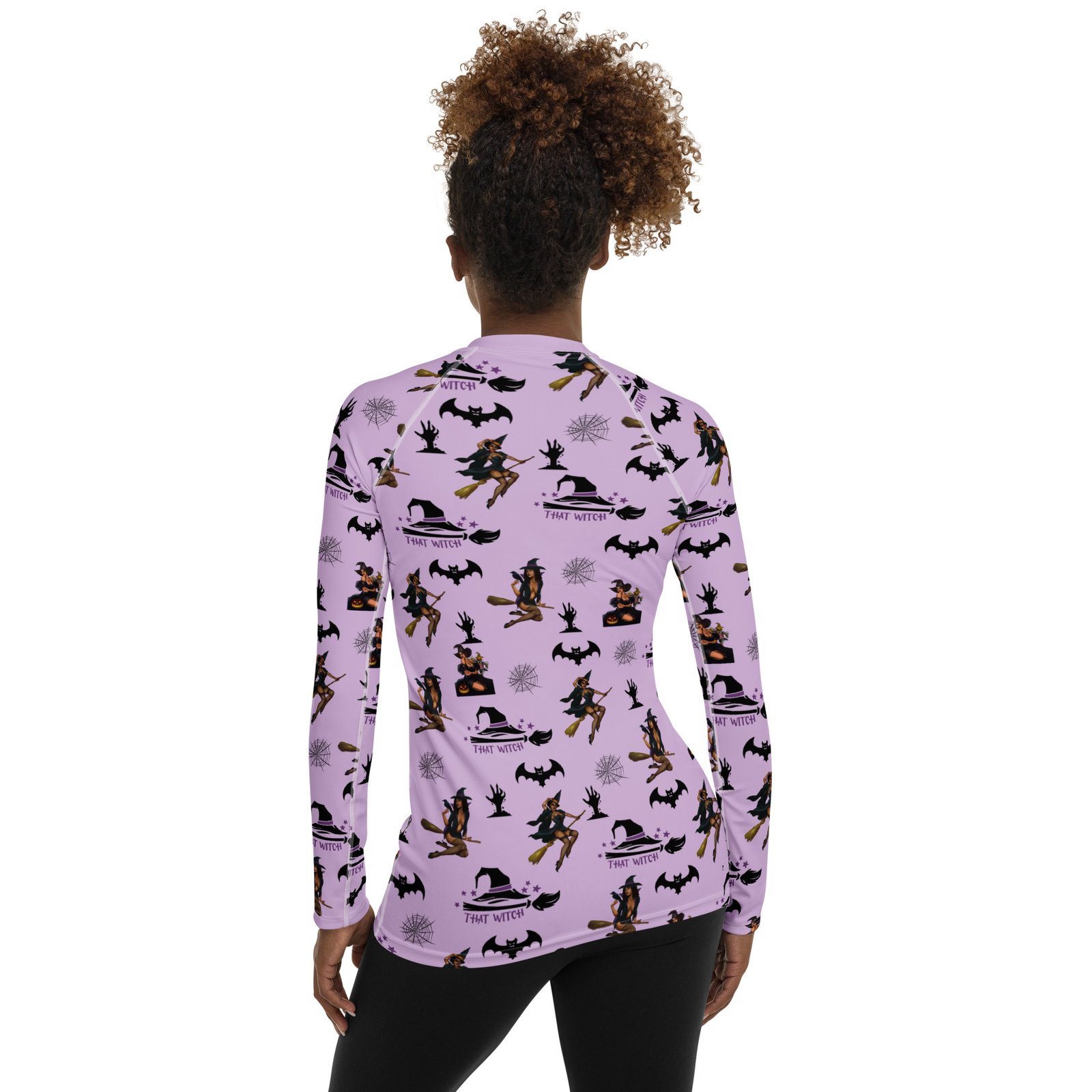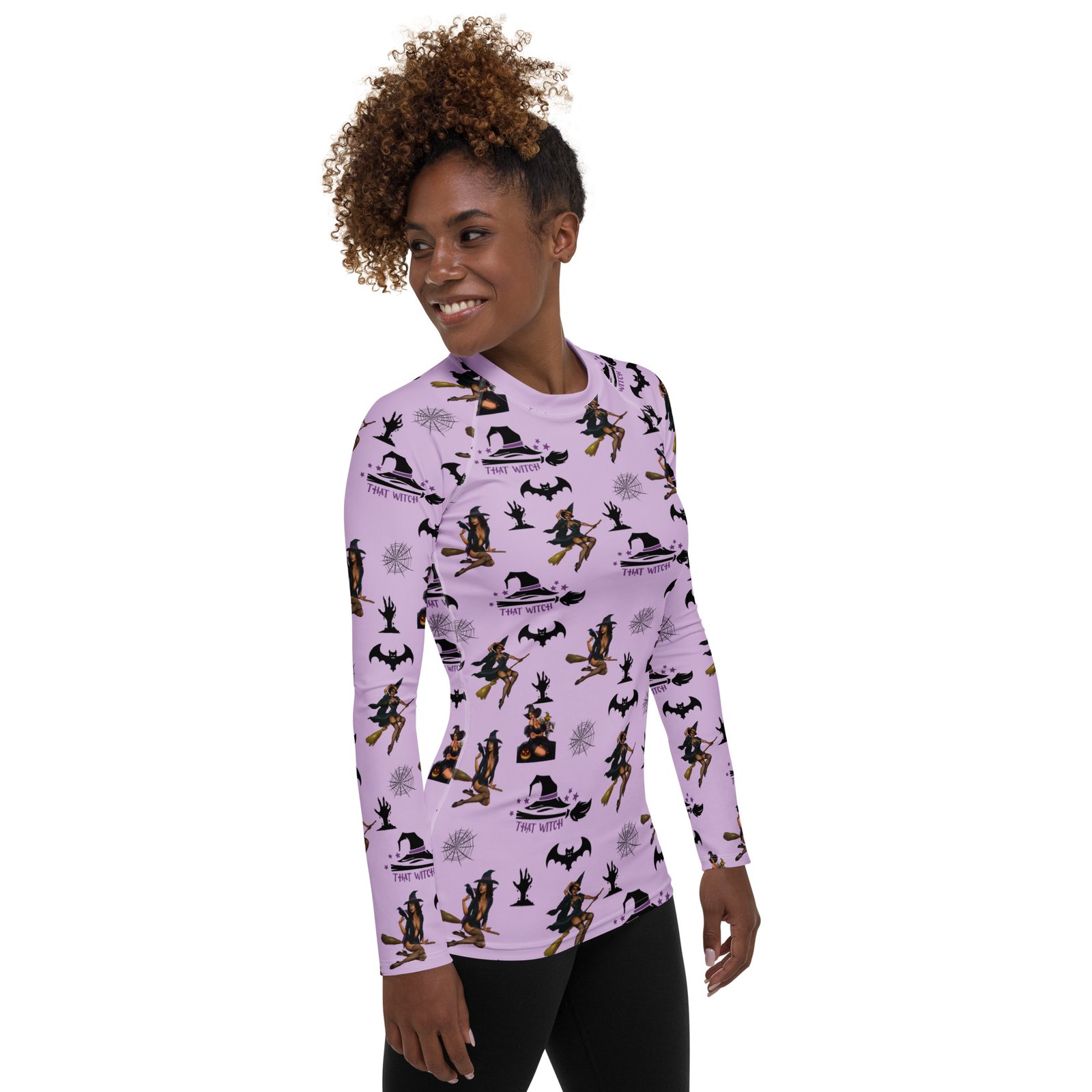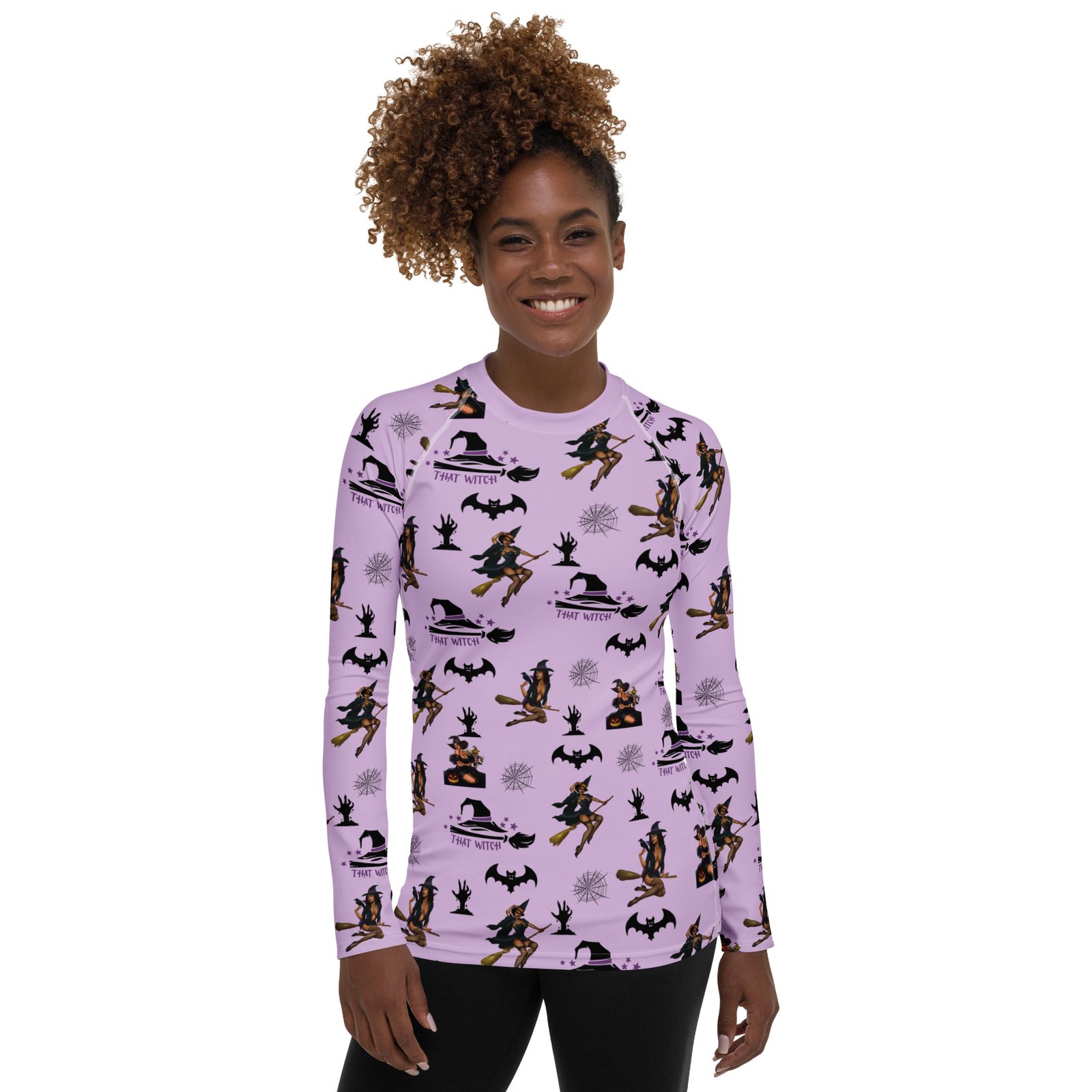Show your playful side this season with the That Witch Women’s Long Sleeve Shirt. Its vibrant all-over Halloween print blends spooky style with everyday comfort, making it a versatile piece for workouts, gatherings, or lounging.